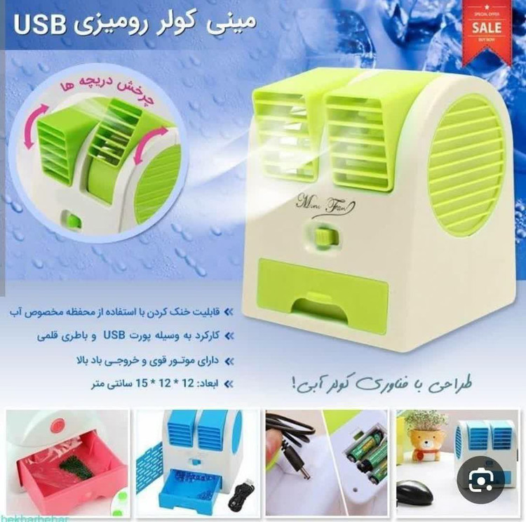 کولر آبی دارای مخزنی که آب پر میشود و مستقیم به برق و هم با باطری قلمی کار میکند